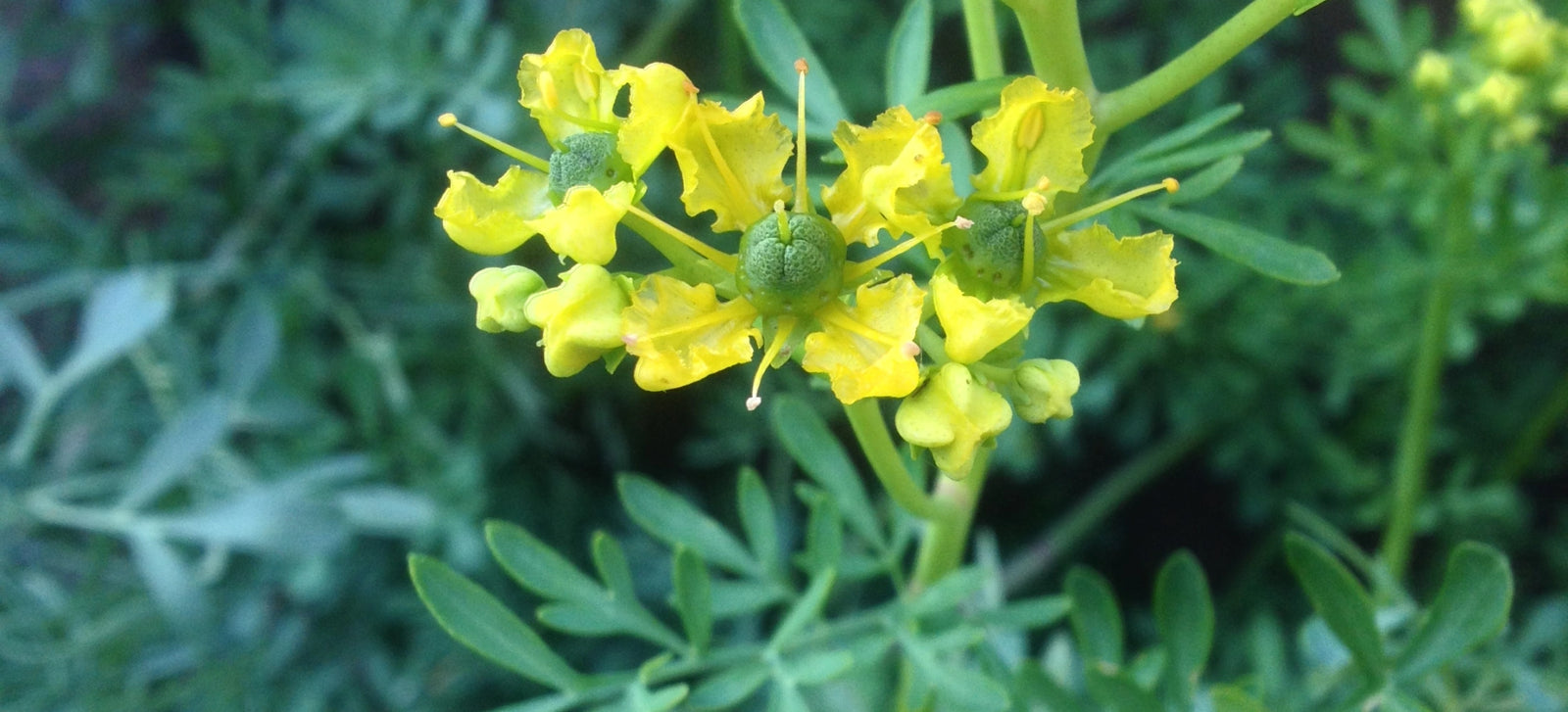 Rue is a pale green plant with a strong aroma often served with coffee. The parts that grow above the ground are also used to make medicine.